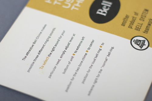Here’s a nifty two color instructional pamphlet for Bell Telephone System. Nice color, layout, type and photography. The dots on the cover of the handset is a nice little abstraction. They are positioned the same as the photo on the inside.