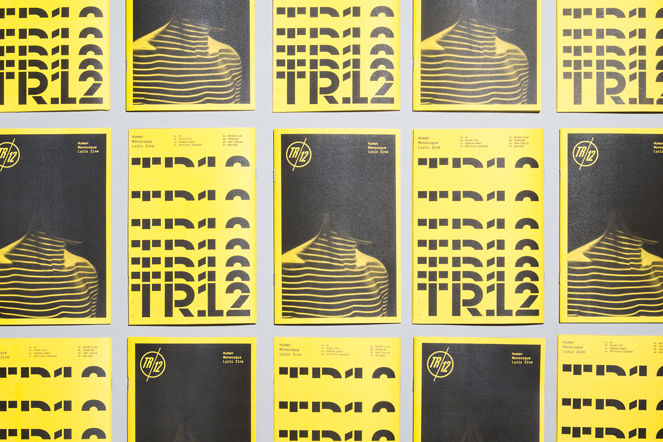 TR/12 is a Sci-Fi minimal synth band based on ideals from the DIY Post-Punk era. The music is made with analog equipment such as the Roland SH-101 and TR-606 that was initially meant to be entry-level and thus limiting in a way. We wanted to keep the branding and design true to it. We created a logo and and cover for their album Human Monocoque with accompanying materials such as diskette labels for MIDI files, a one color photo-copied zine and cassette booklet to reflect the aesthetics of that era.